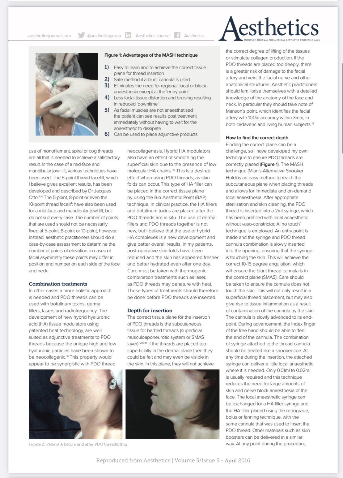 He was also the first in the UK to use Hyaluronic acid with thermally cross-linked low and high weight co-operative complexes as an adjunct to PDO threads.