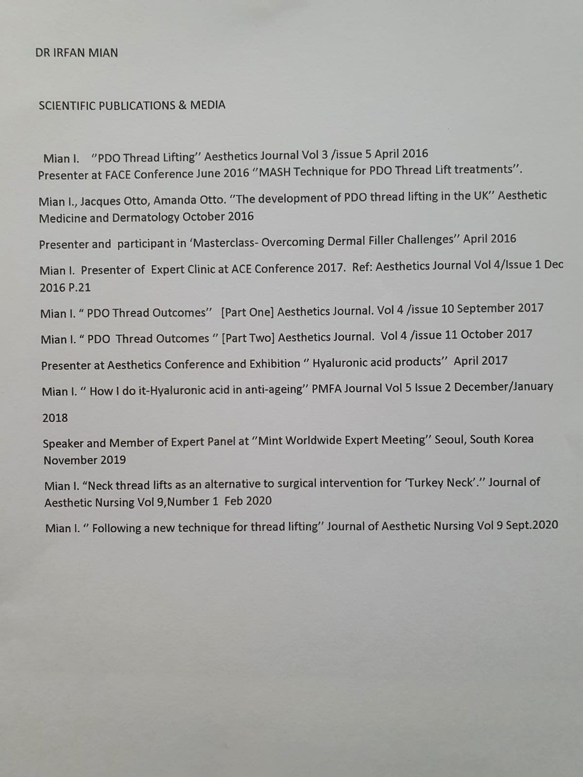 - Writer in the AESTHETICS JOURNAL as leading Aesthetic Practioner https://aestheticsjournal.com/author/dr-irfan-mian