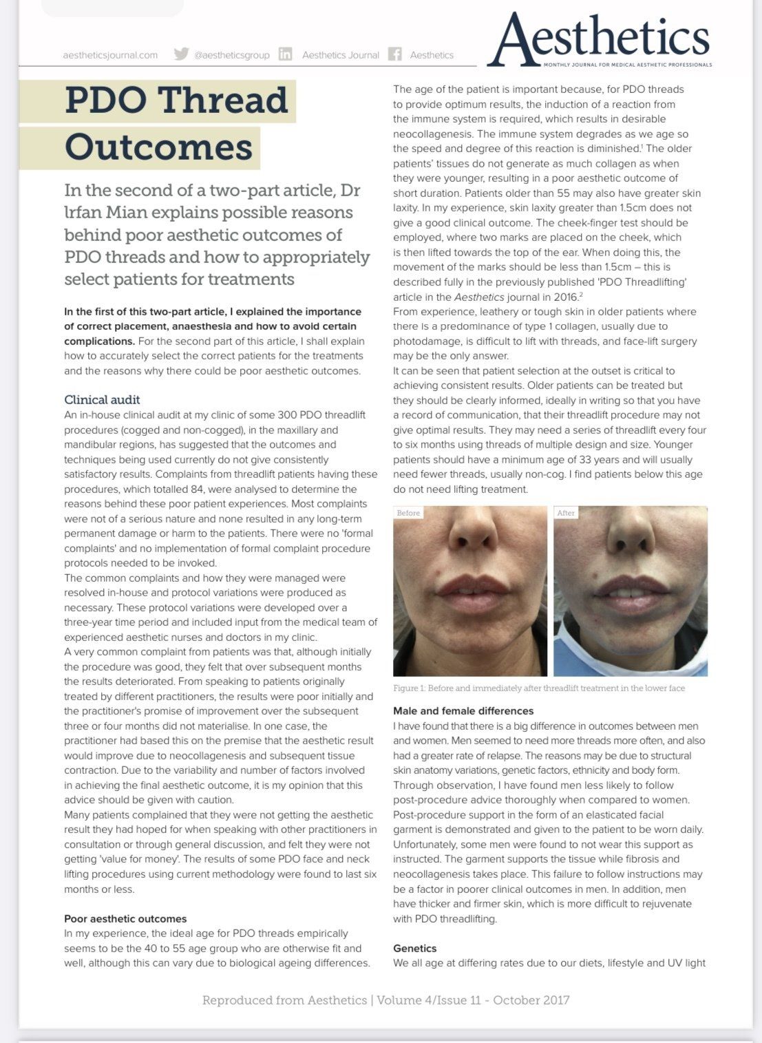 - "Factors involved in tissue-lifting threads" published clinical paper, peer reviewed by Dr Irfan Mian in AESTHETIC NURSING JULY/AUGUST 2021.